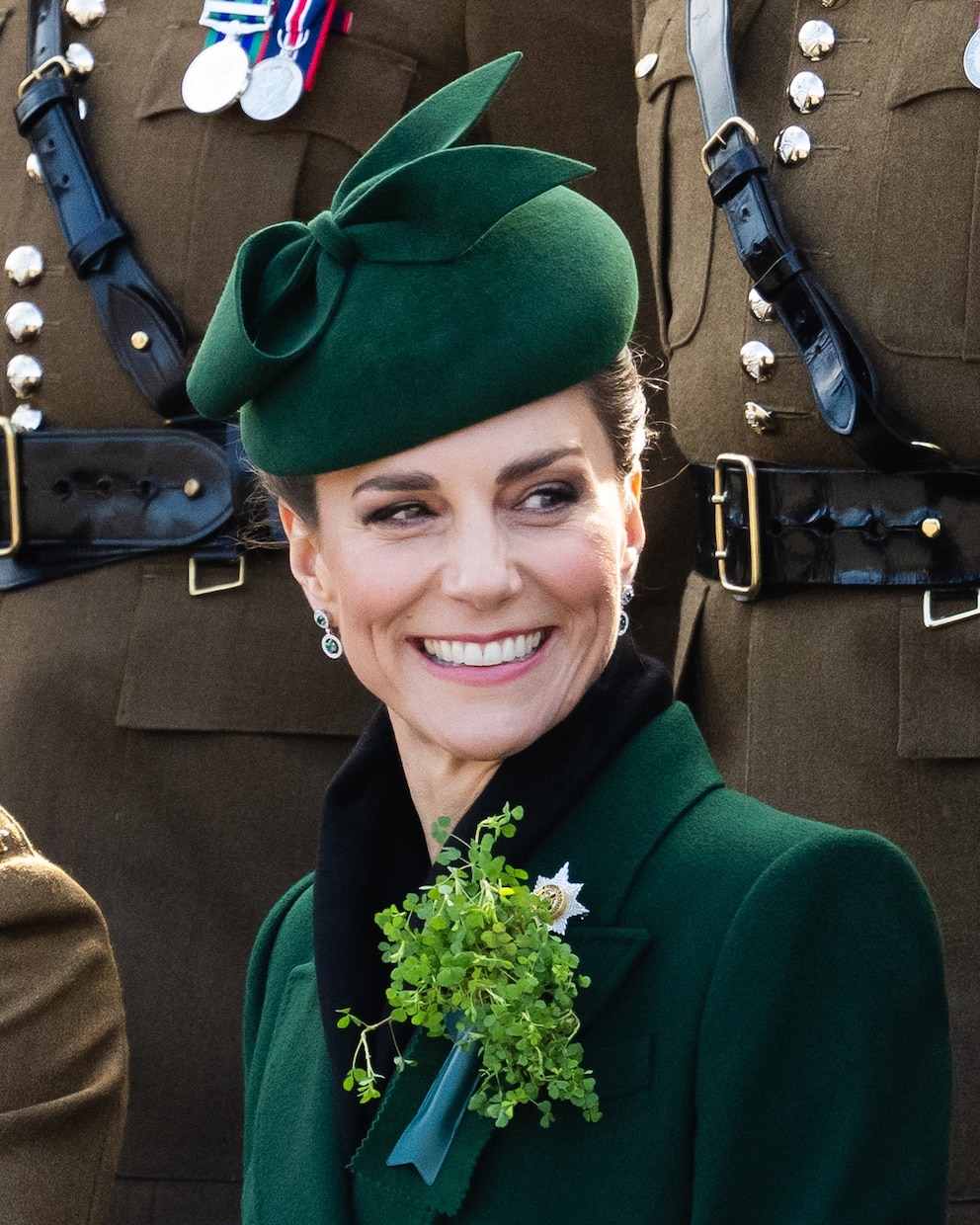 Kate rewore an emerald green coat and matching hat for the occasion, which she donned at Christmas back in 2024, accessorizing with a black belt, gloves and black heeled boots. On her lapel, she added a spray of shamrocks, a traditional Irish emblem.