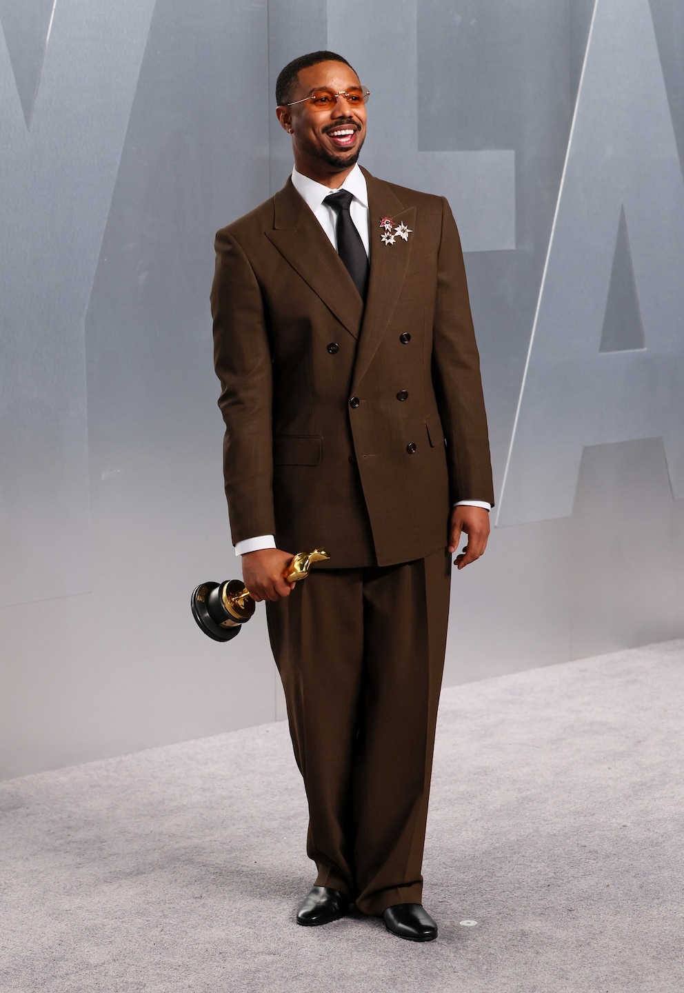 Best actor winner Michael B. Jordan arrived on the Vanity Fair carpet with his newly earned hardware, sporting a brown double-breasted suit after accepting his first Oscar earlier in the evening in a custom tailored all-black Louis Vuitton suit.