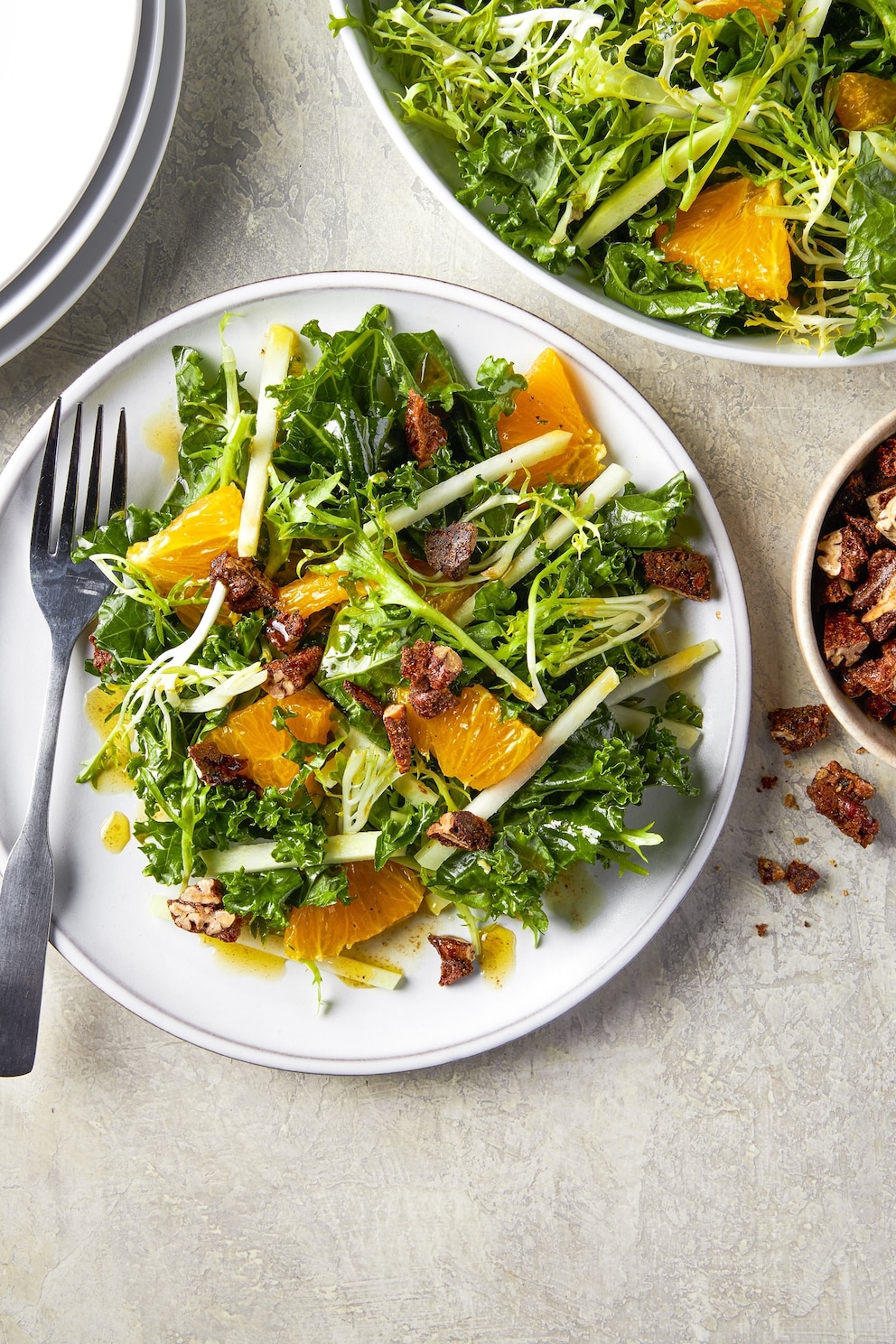 Kale Salad with Kohlrabi, Orange and Candied Pecans