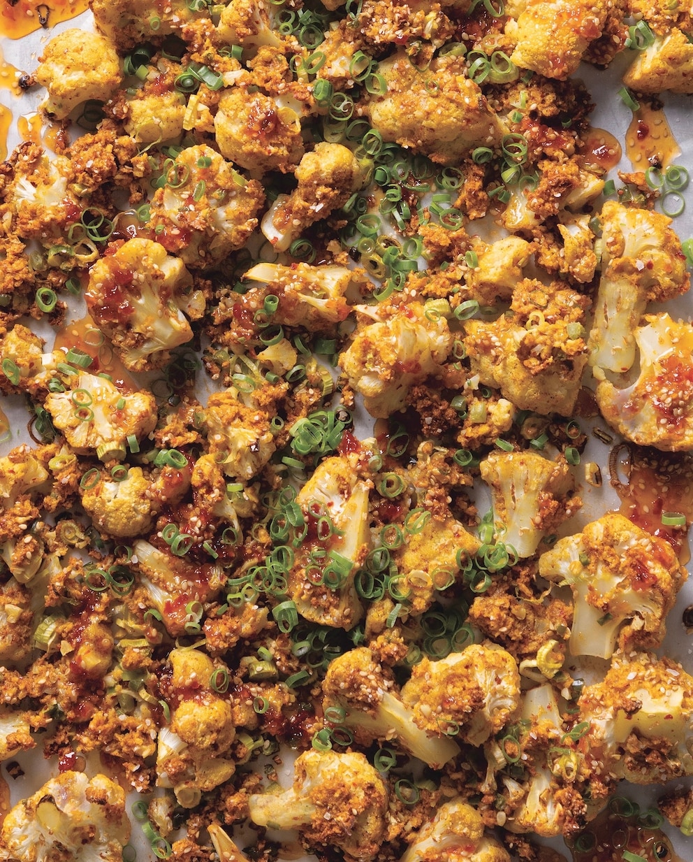 In a large bowl, whisk together the olive oil, eggs, gochugaru, salt, pepper, cinnamon, and turmeric. Add the cauliflower florets and toss to coat.