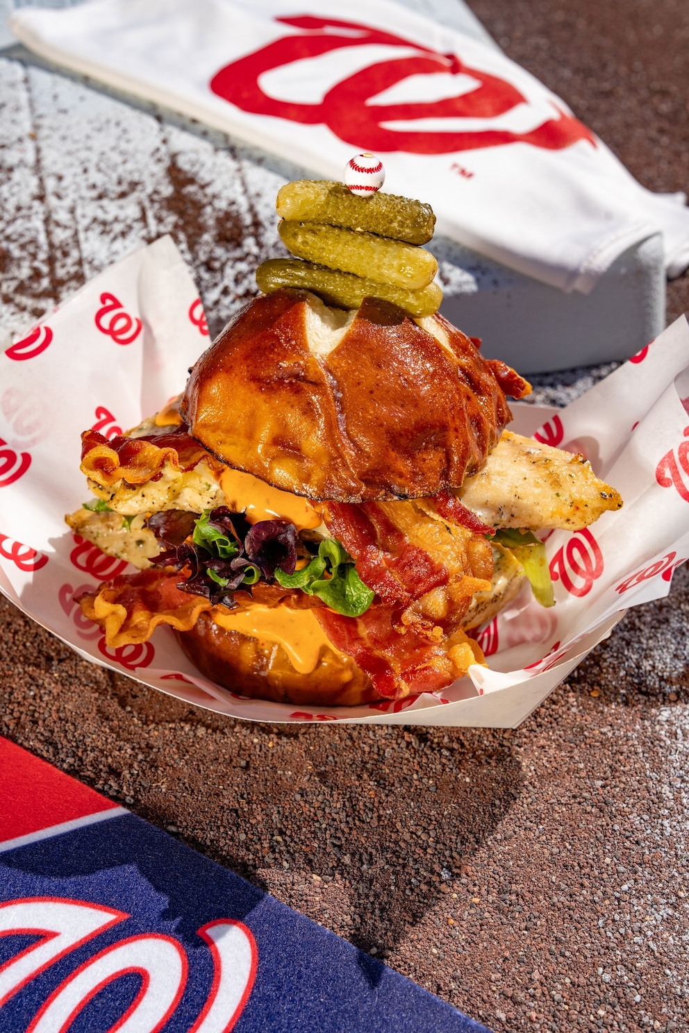 Finally, the DC Monument Chicken Tower, a stacked sandwich inspired by the towering landmark made with grilled chicken, smoked bacon, mixed greens, creamy chipotle ranch and Gruyère cheese on a soft pretzel bun.
