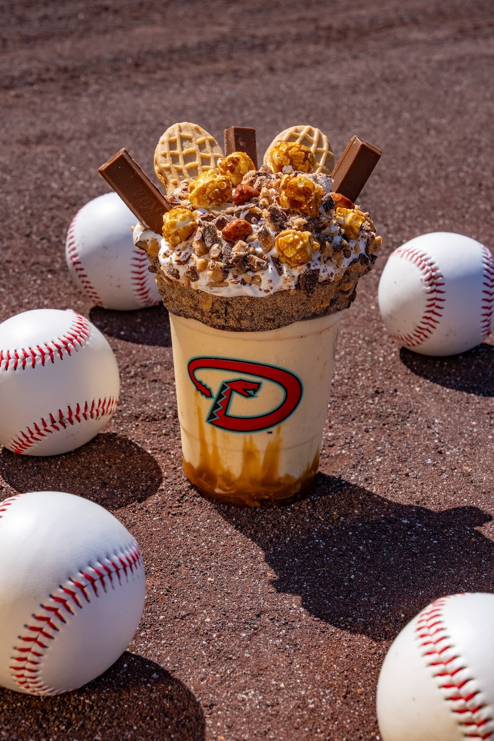 The Take Me Out To The Ballgame Shake is made with everything fans know and love from their first ballpark visit in milkshake form -- a salted caramel shake, whipped cream, peanut butter sandwich cookies, Kit Kat Bars, and Cracker Jacks.