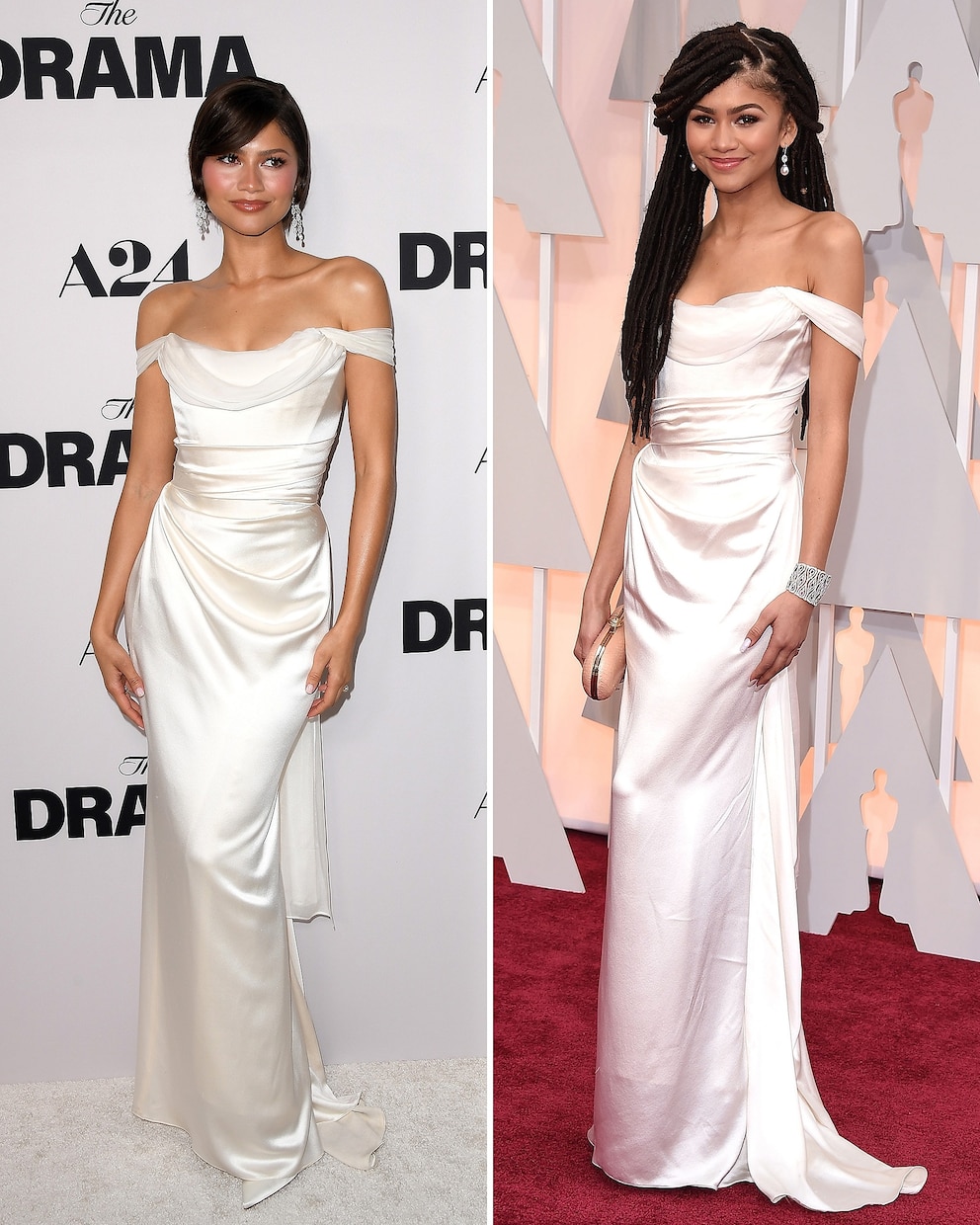 The actress stepped out at the Los Angeles premiere Tuesday night in a white off-the-shoulder gown, which she previously wore to the 2015 Oscars.