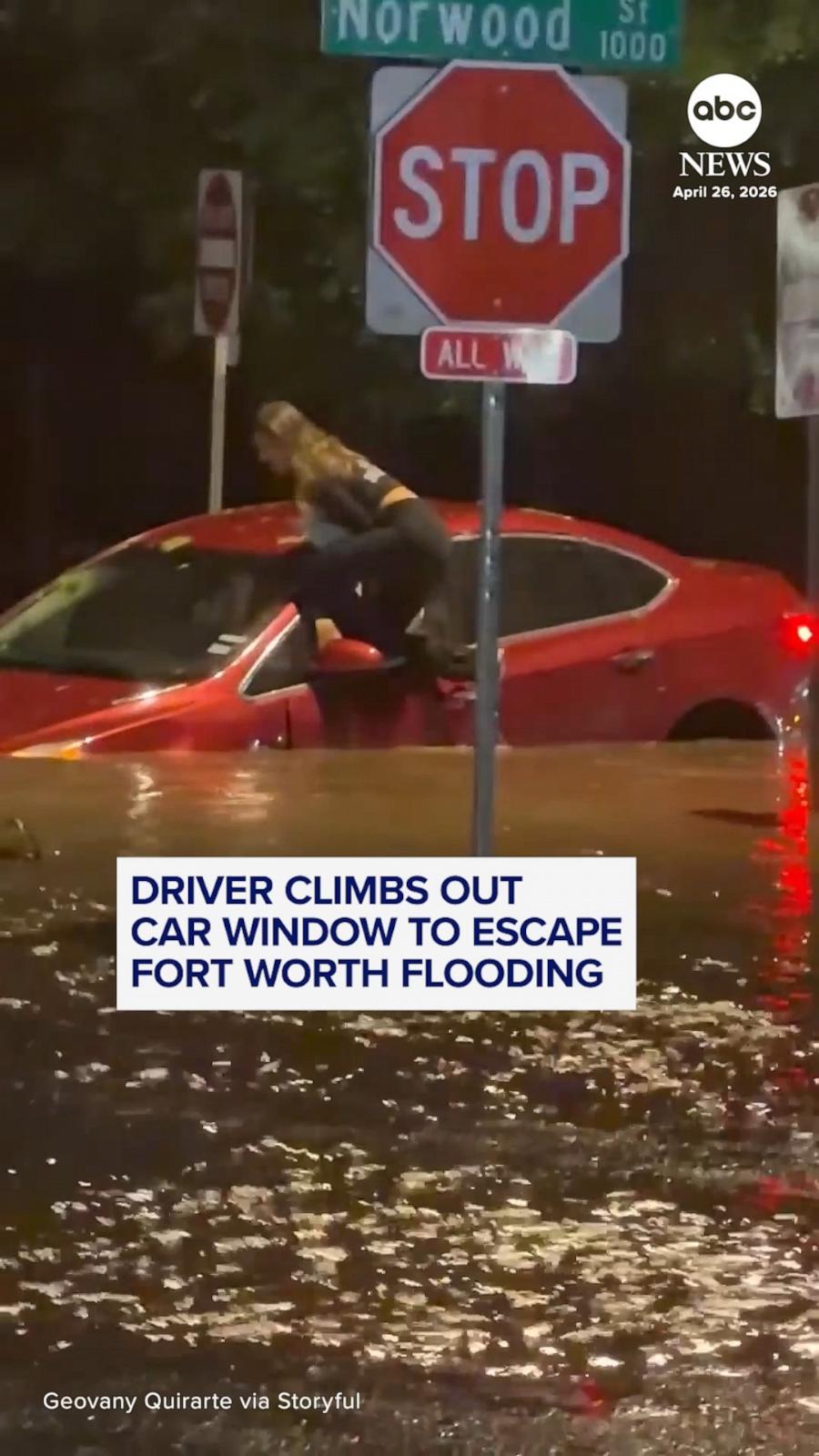 A driver was spotted climbing out of their car window to escape deep floodwaters in Fort Worth, Texas, as severe storms battered the region.